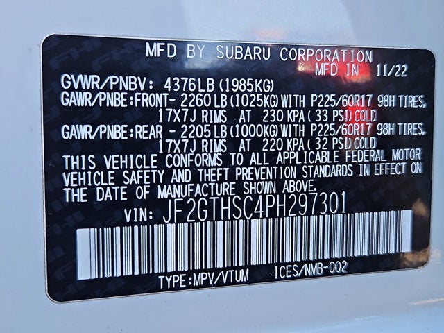 CRYSTAL WHITE PEARL, ALL-WEATHER FLOOR LINERS -inc: Part number J501SFL131, GRAY W/YELLOW STITCHING STARTEX UPHOLSTERY, MOONROOF & BSD W/RCTA & 8.0 MULTIMEDIA PLUS AUDIO -inc: Blind Spot Detection w/Rear Cross-Traffic Alert system off switch exterior power mirrors w/BSD/RCTA detection indicator rear radar detection sensors blind-spot detection lane change assist and rear cross-traffic alert audible vehicle detection warning Power Moonroof tilt up and internal retracting w/auto-open/close Laminated UV and dark tint moonroof glass Radio: Subaru STARLINK 8.0 Multimedia Plus System AM/FM stereo HD Radio single disc CD player w/MP3/WMA/CRR/RW file capability multi-touch gesture high resolution display screen voice activated controls Bluetooth® audio streaming and hands-free phone connectivity Bluetooth® hands-free SMS text messaging connectivity Near Field Communication (NFC) iPod control capability SiriusXM All Access Radio (4 months free trial/subscription required after) SiriusXM Travel Link (4 months free trial/subscription required after) smartphone integration: AHA Android Auto, MAP & DOME LIGHTS LED UPGRADE -inc: Part number H461SFL100, All Wheel Drive, Power Steering, ABS, 4-Wheel Disc Brakes, Brake Assist, Brake Actuated Limited Slip Differential, Aluminum Wheels, Tires - Front All-Season, Tires - Rear All-Season, Temporary Spare Tire, Heated Mirrors, Power Mirror(s), Integrated Turn Signal Mirrors, Rear Defrost, Privacy Glass, Intermittent Wipers, Variable Speed Intermittent Wipers, Rear Spoiler, Power Door Locks, Daytime Running Lights, Automatic Headlights, Fog Lamps, AM/FM Stereo, CD Player, Satellite Radio, MP3 Capability, Bluetooth® Connection, Auxiliary Audio Input, HD Radio, Smart Device Integration, Requires Subscription, MP3 Capability, Steering Wheel Audio Controls, Bluetooth® Connection, Bucket Seats, Heated Front Seat(s), Pass-Through Rear Seat, Rear Bench Seat, Adjustable Steering Wheel, Trip Computer, Power Windows, WiFi Hotspot, Leather Steering Wheel, Remote Trunk Release, Keyless Entry, Power Door Locks, Keyless Entry, Power Door Locks, Keyless Start, Cruise Control, Adaptive Cruise Control, Climate Control, A/C, Premium Synthetic Seats, Driver Vanity Mirror, Passenger Vanity Mirror, Driver Illuminated Vanity Mirror, Passenger Illuminated Visor Mirror, Floor Mats, Cargo Shade, Keyless Start, Smart Device Integration, Smart Device Integration, Requires Subscription, Power Windows, Power Door Locks, Trip Computer, Security System, Immobilizer, Cruise Control Steering Assist, Traction Contr