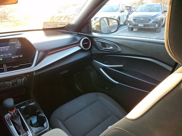 LICENSE PLATE FRONT MOUNTING PACKAGE, AUDIO SYSTEM CHEVROLET INFOTAINMENT 3 SYSTEM 8 diagonal color touchscreen AM/FM stereo Bluetooth® audio streaming for 2 active devices voice command pass-through to phone Wireless Apple CarPlay and Wireless Android Auto compatibility (STD), WHEELS 18 (45.7 CM) BLACK-PAINTED MACHINED ALUMINUM (STD), JET BLACK/GRAY WITH RED ACCENTS CLOTH SEAT TRIM, TRANSMISSION 6-SPEED AUTOMATIC (STD), DRIVER CONFIDENCE PACKAGE includes (UD7) Rear Park Assist (UFG) Rear Cross Traffic Alert and (UKC) Lane Change Alert with Side Blind Zone Alert, ENGINE ECOTEC 1.2L TURBO DOHC DI WITH VARIABLE VALVE TIMING (VVT) (137 hp [102 kW] @ 5000 rpm 162 lb-ft of torque [219 N-m] @ 2500 rpm) (STD), REAR CROSS TRAFFIC ALERT, LANE CHANGE ALERT WITH SIDE BLIND ZONE ALERT, LPO CARGO LINER JET BLACK, MOSAIC BLACK METALLIC, 1RS PREFERRED EQUIPMENT GROUP Includes Standard Equipment, AXLE 3.50 FINAL DRIVE RATIO, SEATS FRONT BUCKET (STD), Lane Departure Warning, Lane Keeping Assist, Front Collision Mitigation, Front Collision Warning, Automatic Highbeams, Turbocharged, Front Wheel Drive, Power Steering, ABS, 4-Wheel Disc Brakes, Aluminum Wheels, Tires - Front Performance, Tires - Rear Performance, Temporary Spare Tire, Rear Spoiler, Automatic Headlights, Automatic Highbeams, Heated Mirrors, Power Mirror(s), Privacy Glass, Intermittent Wipers, Variable Speed Intermittent Wipers, Tow Hooks, AM/FM Stereo, Bluetooth® Connection, Auxiliary Audio Input, Smart Device Integration, WiFi Hotspot, Bluetooth® Connection, Smart Device Integration, Bucket Seats, Cloth Seats, Heated Front Seat(s), Pass-Through Rear Seat, Rear Bench Seat, Floor Mats, Floor Mats, Heated Steering Wheel, Adjustable Steering Wheel, Cruise Control, Steering Wheel Audio Controls, Front Collision Warning, Power Windows, Power Windows, Power Windows, Power Door Locks, Remote Engine Start, Cruise Control, Security System, Immobilizer, Security System, A/C, Rear Defrost, Driver Vanity Mirror, Passenger Vanity Mirror, Front Collision Mitigation, Front Collision Warning, Front Collision Mitigation, Traction Control, Stability Control, Daytime Running Lights, Driver Air Bag, Passenger Air Bag, Front Side Air Bag, Rear Side Air Bag, Front Head Air Bag, Rear Head Air Bag, Passenger Air Bag Sensor, Telematics, Requires Subscription, Back-Up Camera, Front Collision Warning, Lane Departure Warning, Lane Keeping Assist, Driver Restriction Features, Tire Pressure Monitor, Tire Pressure Monitor, Telematics, Requires Subscription